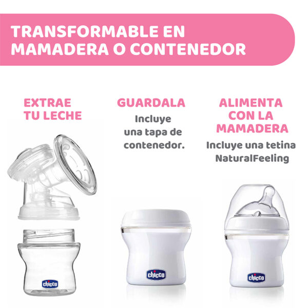 Sacaleche ELECTRICO marca CHICCO compacto, inalambrico y silencioso para llevar a todos lados y extraer en cualquier lugar. Cuenta con 2 fases para imitar el movimiento de succion del bebe. Posee 5 niveles de extraccion con indicador led. La unidad de extraccion posee una bateria recargable con autonomia de 90min. Incluye cable USB.Incluye tetina NATURAL FEELING para convertir el vaso contenedor en mamadera, ademas de una tapa selladora para conservar de una manera segura la leche.